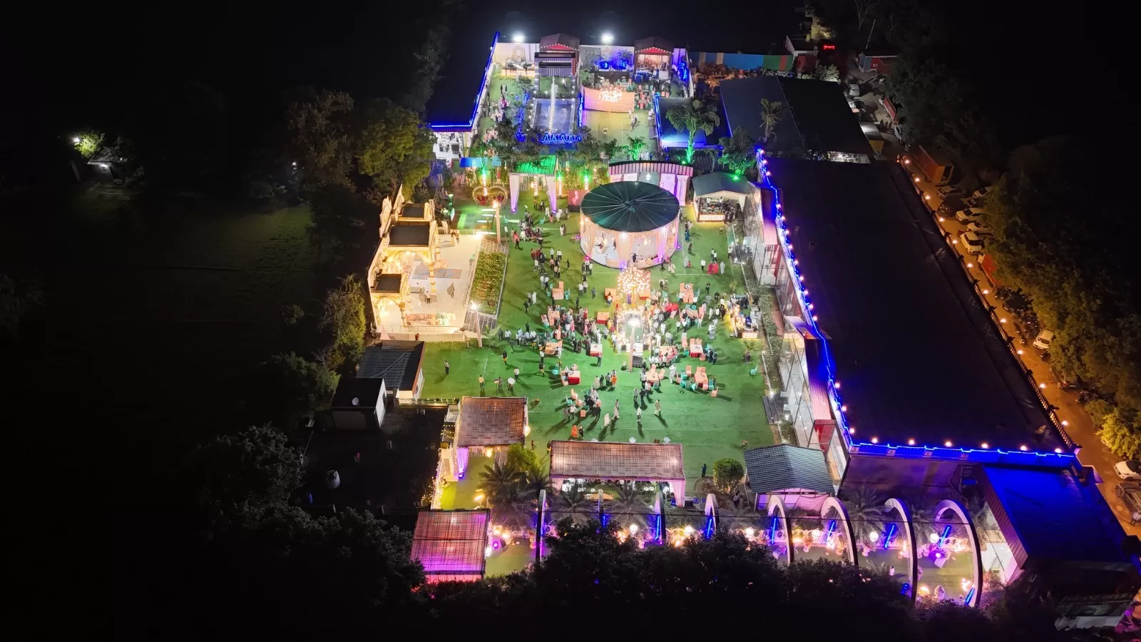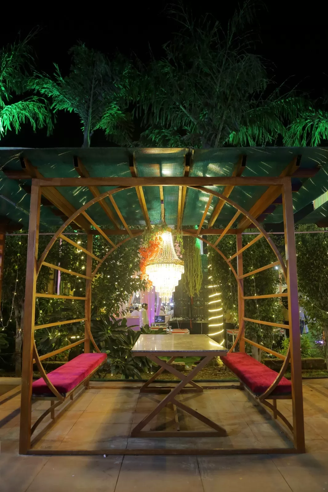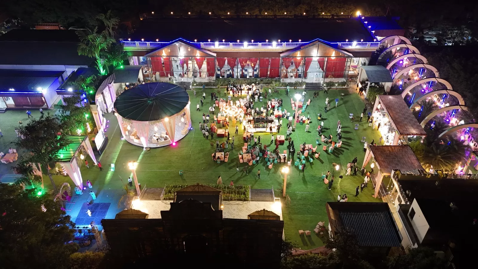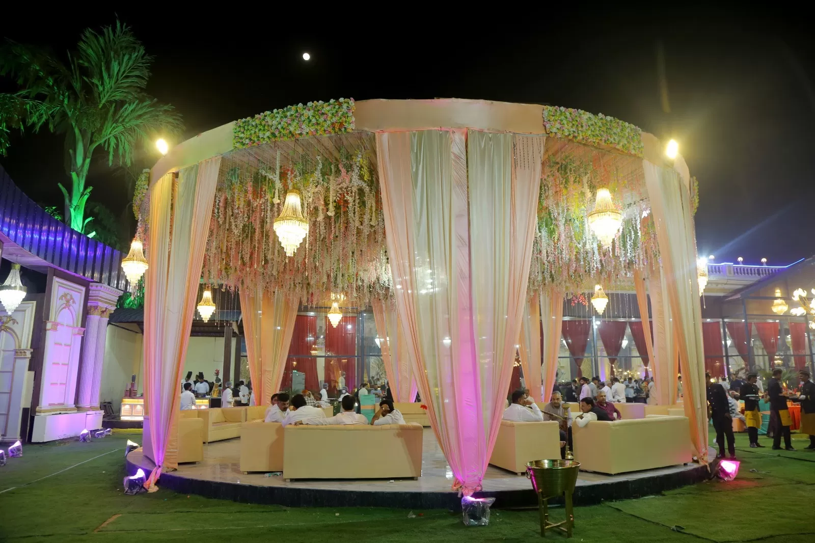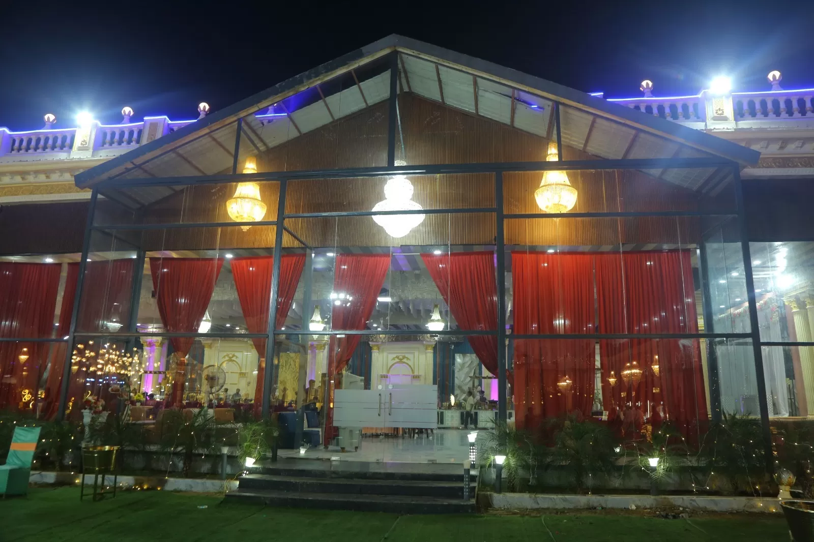 The indoor hall comfortably accommodates large gatherings while maintaining a classy and intimate feel, making it perfect for evening events and formal functions.
